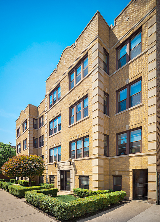 Four-story yellow brick apartment building with multiple windows, landscaped bushes, and a sidewalk under a clear blue sky.